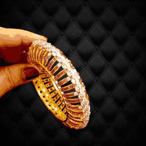 CRYSTAL STORY: Ruby in baguette shape along with imported Zirconia crystals in marquise and round shape are used in this eye-catching bangle.